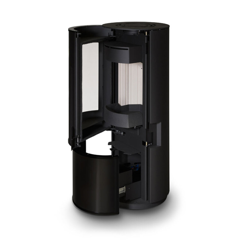 Elegantní a kompaktní krbová kamna kruhového půdorysu s bohatou prosklenou čelní plochou, vhodná pro každý interiér. Kamna skvěle vyniknou i uprostřed místnosti. Krbová kamna jsou vhodná pro nízkoenergetické domy. Disponují systémem centrálního přívodu externího vzduchu. Odvětrávaná designová klika umožňuje manipulaci během topení. Dveře je možné aretovat v poloze otevřeno. Ve standardu je možné zapojení horního nebo zadního odvodu spalin. Díky sekundárnímu přívodu vzduchu je sklo dvířek omýváno, a tak nedochází k usazování nečistot. Spalovací komora je vyložena betonovými tvarovkami. Regulaci primárního a sekundárního přívodu vzduchu lze řídit jediným ovládacím prvkem.