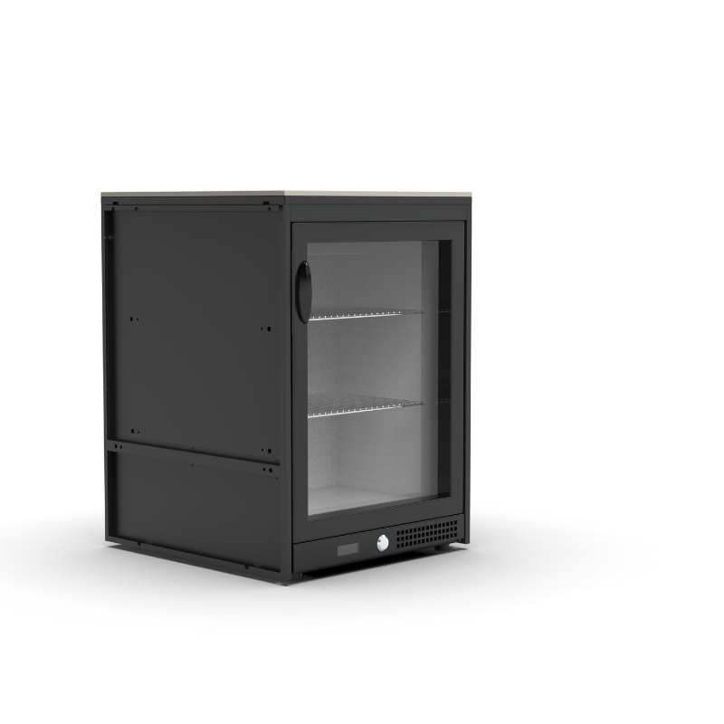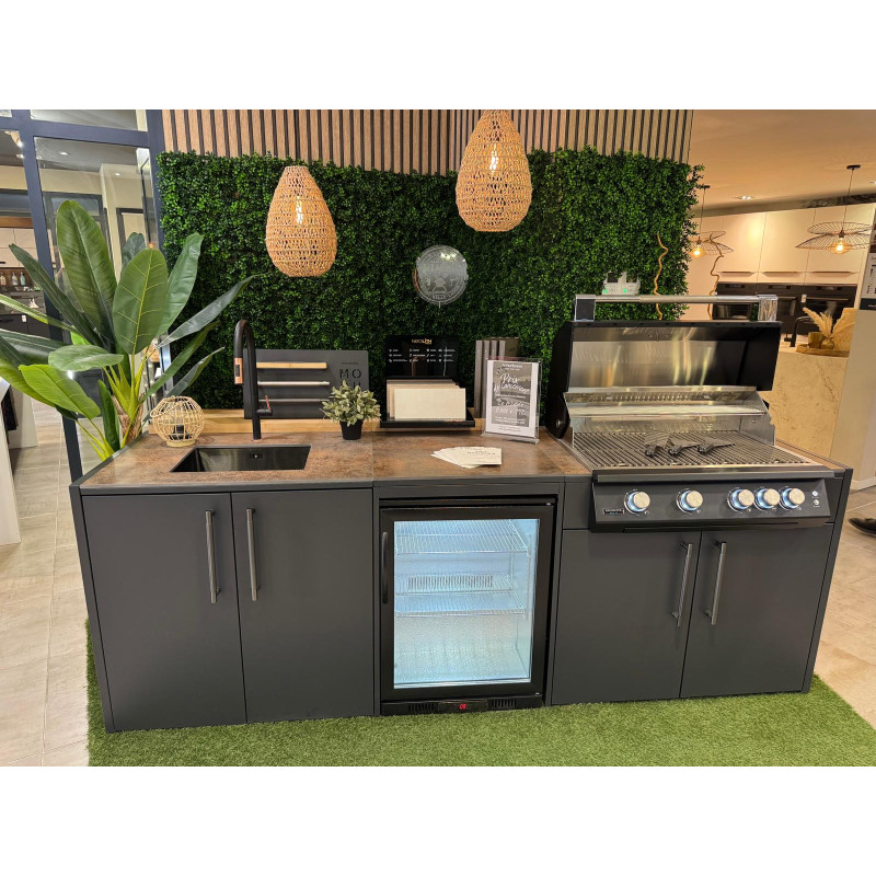 Uvnitř modulu najdete již nainstalovanou kompaktní ledničku , navrženou speciálně pro venkovní použití. Nabízí spolehlivé chlazení i v horkých podmínkách a má dostatek prostoru pro uložení lahví, omáček a dalších nezbytností, které udrží vaši kuchyň čistou a organizovanou. Abyste měli odolnou a snadno čistitelnou přípravnou plochu, je vrchní deska opatřena povrchovou úpravou ze slinutého kamene Neolith. Tento materiál je neporézní, žáruvzdorný a nenechává skvrny. Ať už podáváte nápoje, krájíte ovoce nebo stavíte pánev, povrch vydrží skvěle.
