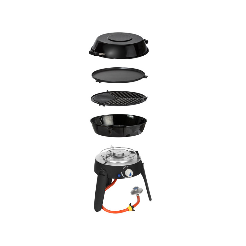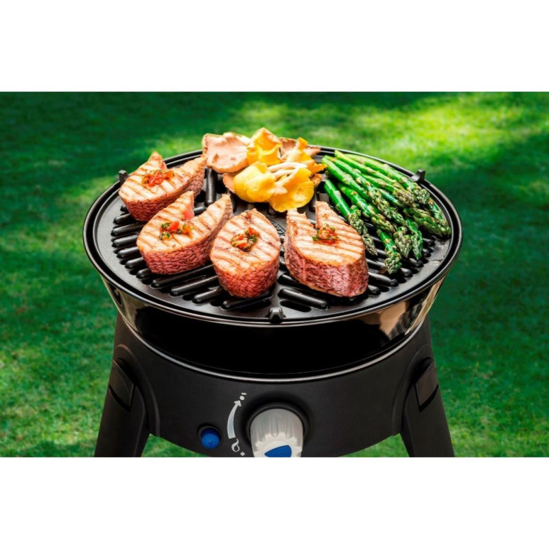 Všestranný plynový gril Safari Chef je kombinací hned několika skvělých vlastností. Kompaktní rozměry, nízká hmotnost, jednoduchost použití, množství grilovacích ploch, snadné složení a ukládání, a to vše za velmi příznivou cenu. Ať už vyrazíte do přírody, na ryby, kempovat nebo si uděláte grilovací party na balkóně, tento gril vás rozhodně nezklame. Snazší už to být nemůže! Výkonný kulatý hořák z nerezové oceli s piezoelektrickým zapalováním nabízí jemně nastavitelnou regulaci teploty, což zajišťuje konzistentní výsledky při grilování. Hliníkový grilovací rošt má integrovaný tepelný difuzor pro dokonalé zahřátí a je potažen keramickou vrstvou Greengrill pro zdravé a čisté vaření. Víko po otočení slouží jako velký hrnec s madly. Gril je nízkotlaký, proto je pro jeho fungování potřeba regulační ventil, pomocí kterého gril připojíte k 2,5kg, 5kg nebo 10kg PB lahvi, ale také k plynové kartuši. Podle typu lahve či kartuše je ale potřeba zvolit i správný typ ventilu. Potom stačí vše připojit a grilování může začít. A nejen grilování - můžete smažit, vařit i péct.