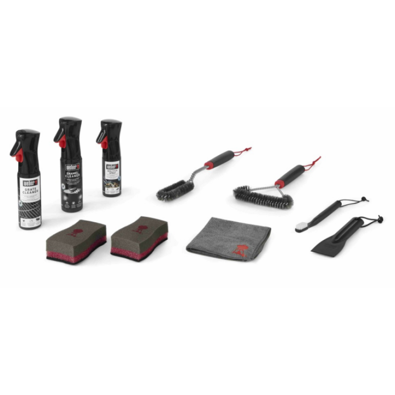 Ošetřujte svůj gril s trochou péče a lásky, a bude po mnoho sezón vypadat i grilovat jako nový. Důkladné čištění čas od času může dělat divy a zajistí nejen úžas, ale také bezpečnost a optimální rozvod tepla. V sadě na čištění speciálně vyráběné pro smaltované plynové grily Weber® dostanete všechny nástroje potřebné pro udržení vašeho grilu v plném lesku a funkčnosti. Obsahuje kartáče, čistící prostředky, houbičku, hadřík a sprej na promazání roštů.