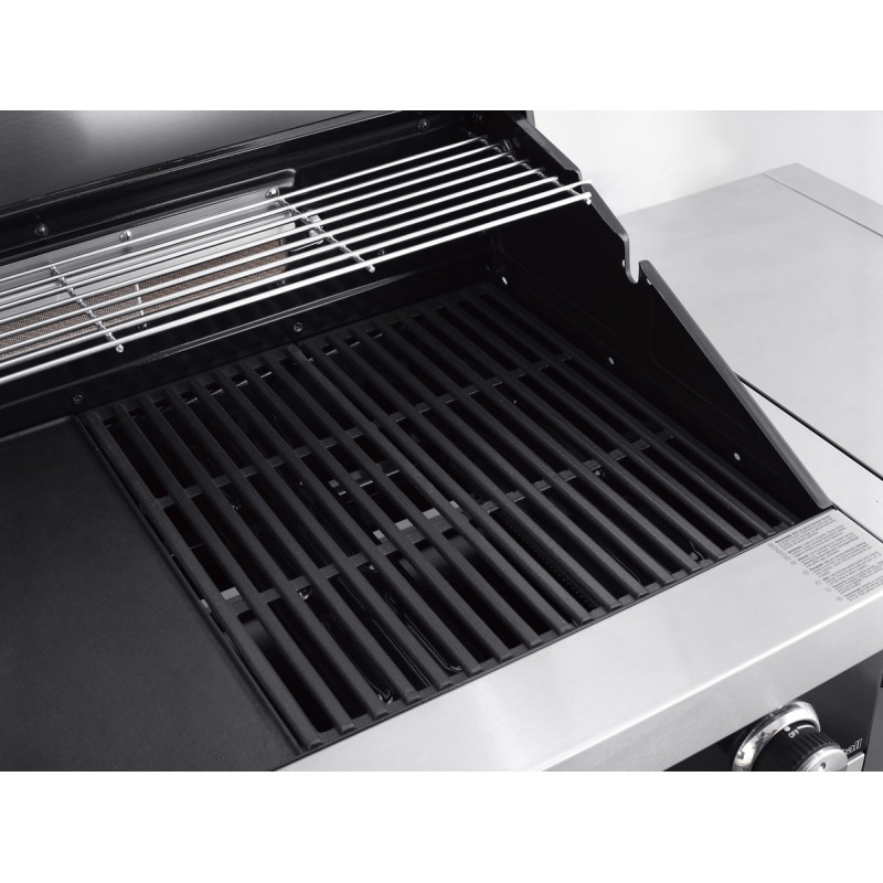 Zahradní gril se 4 nerezovými hořáky a 1 praktickým bočním hořákem. Krásná sestava grilu s postranními policemi uspokojí i ty nejnáročnější zájemce o grilování. Gril pro ty, kteří nehledají extra velký gril, avšak požadují výkon, dostatek úložného prostoru, kvalitu a pěkný vzhled. Čtyři výkonné hořáky jsou zárukou dostatečného tepla na grilovacím roštu. Přílohy, omáčky, maso a polévky pohodlně připravíte na bočním hořáku. Celolitinový grilovací rošt o rozměru 60x45 cm je složen ze 2 roštů a 1 celistvé desky pro grilování drobných pokrmů a jídel, které by standardním roštěm propadly (omelety, klobásky, zelenina, mořské plody). Samozřejmostí je přehledný teploměr ve víku grilu, ohřívací rošt a předem výsuvná zásuvka pro přebytečný omastek. Netradiční a atraktivní provedení se 2 bočními skříňkami nabízí dostatek úložného prostoru pro plynovou láhev a grilovacího příslušenství. Odkládací místo podpoří police mezi skříňkami.