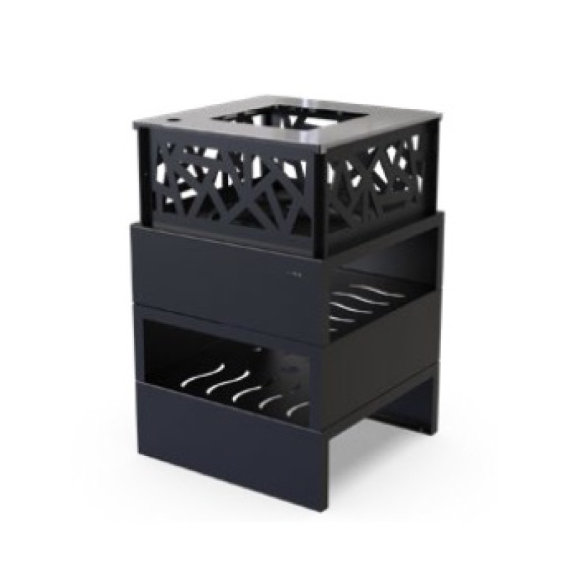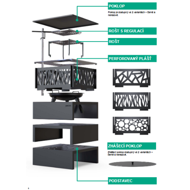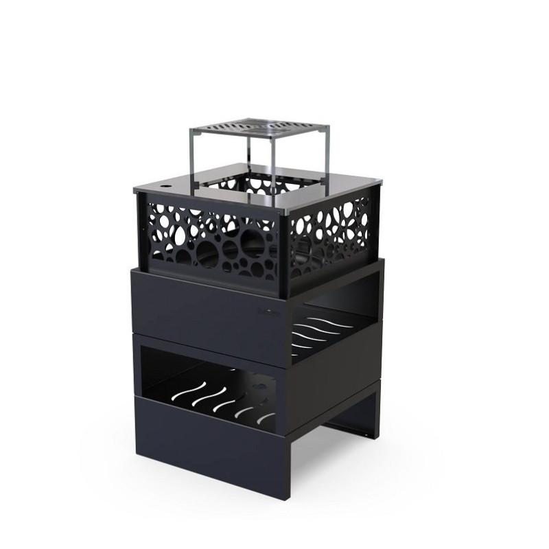 Elegantní design topeniště s geometrickým prolamováním ve tvaru kruhů, výřezů nebo plamínků z něj činí jedinečnou ozdobu vaší zahrady. Omega 53 L je nejen perfektní grilovací zařízení, ale také originální osvětlení a zdroj tepla pro chladné večery.