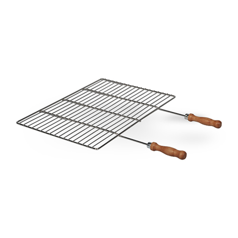 Nerezový grilovací rošt o rozměru 530x380 mm s dřevěnými bukovými držadly s povrchovou úpravou.