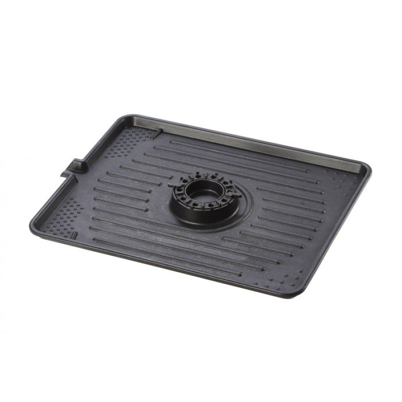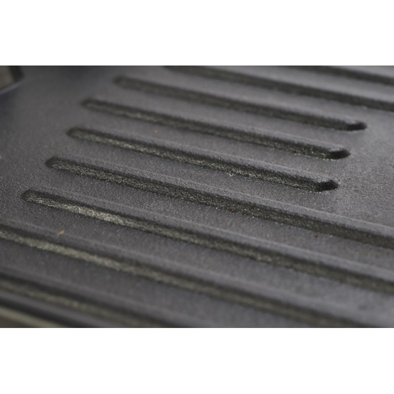 Grilovací deska s regulací, nepřilnavým povrchem a otvorem pro odtok tuku.
