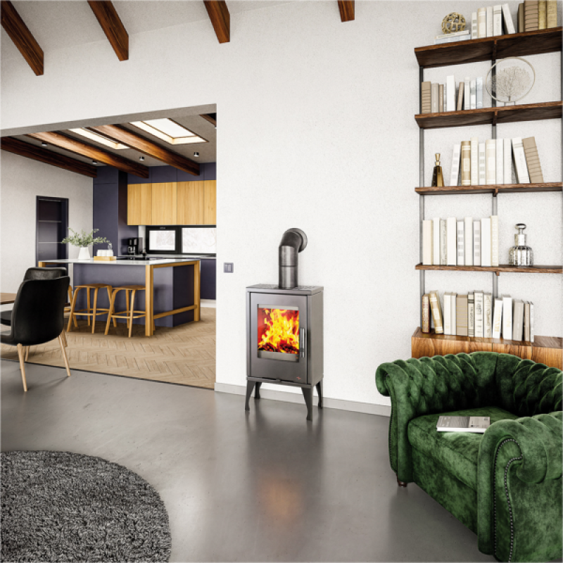 Kamna na dřevo o výkonu 3 – 6,3 kW mají externí přívod vzduchu, možnost ho uzavřít (když v kamnech netopíte, aby vám neunikal ohřátý vzduch z místnosti) a terciární spalování. Vyhřejí prostor do 114 m3.