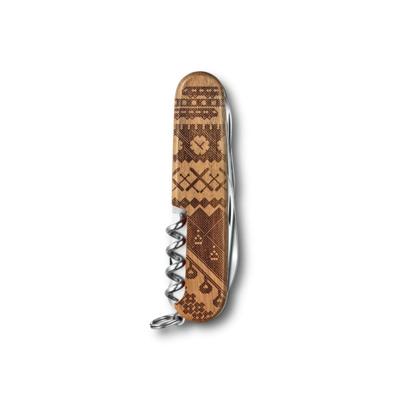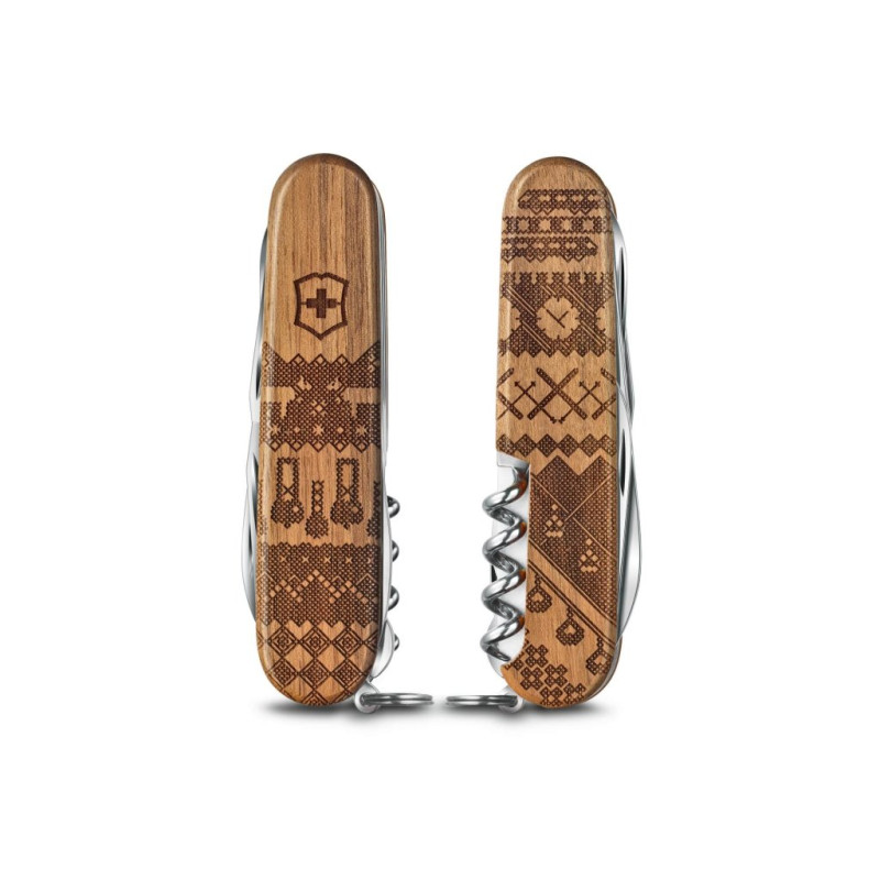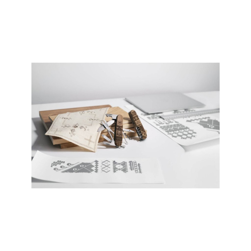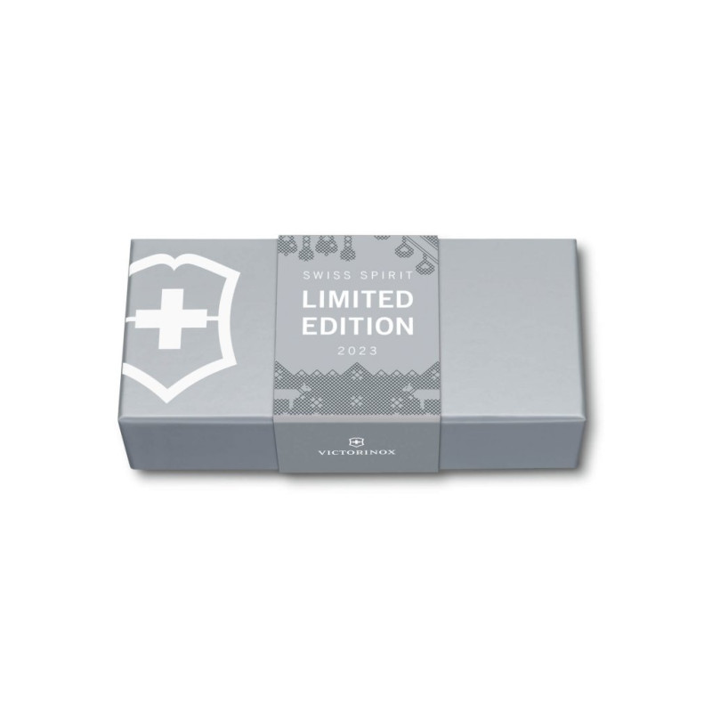 Kapesní nůž Companion Wood Swiss Spirit Limited Edition 2023 je inspirován tím, co dělá Švýcarsko velkým. Jedinečný design na střenkách nože vypráví křížkovým stehem příběh této země, kde společně vedle sebe kráčí moderní technika a tradiční hodnoty. Střenky z ořechového dřeva na přední straně nože zdobí tradičnější prvky země s krávami, zvonky a horami. Zadní strana představuje vyspělé moderní technologie v podobě vlaků, hodinek, lyží a lanovek. Každý z 12 000 kusů limitované edice je jedinečný. Díky 13 praktickým funkcím, které doplňují tento výrazný vzhled, je nůž odvážnou, vzrušující památkou, dárkem nebo dokonalým doplňkem sbírky.