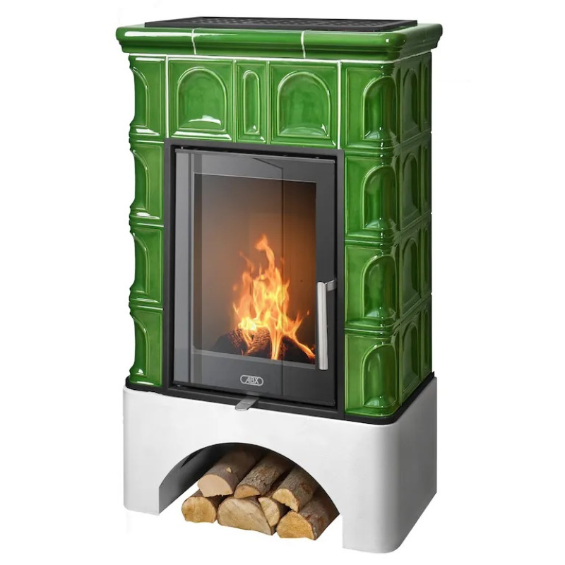 - Kachlová kamna klasického designu s litinovým čelem a dvířky.