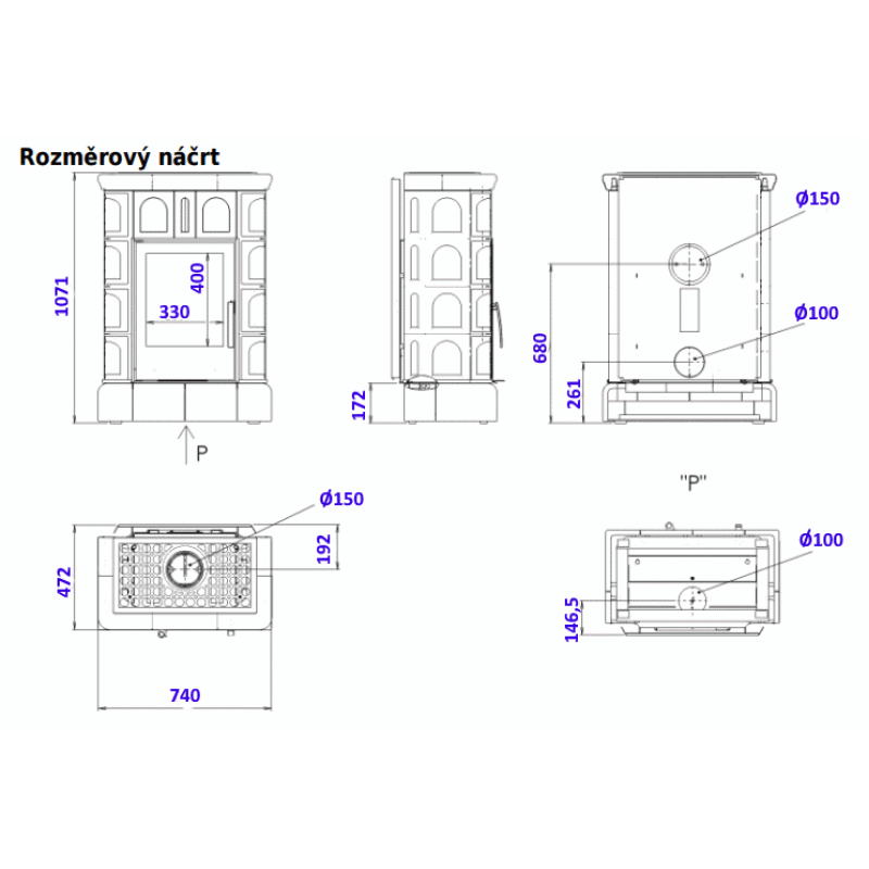 Ocelové topeniště má vermikulitovou vyzdívku, litinová dvířka a litinový rošt.