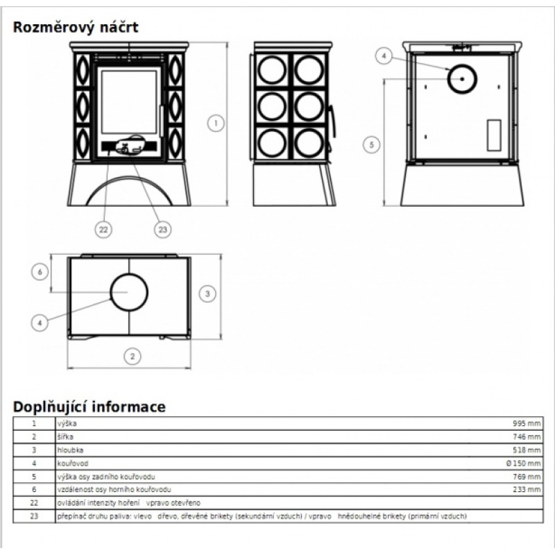 - Použitá krbová vložka je litinová, topeniště je vyloženo vermeculitem.