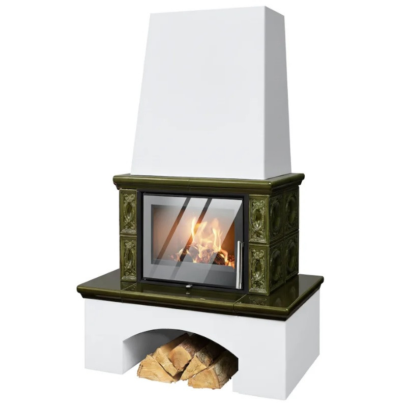 Kachlová kamna ABX Lombardie exklusive, bílý sokl, černý korpus, opláštění zelená kachle