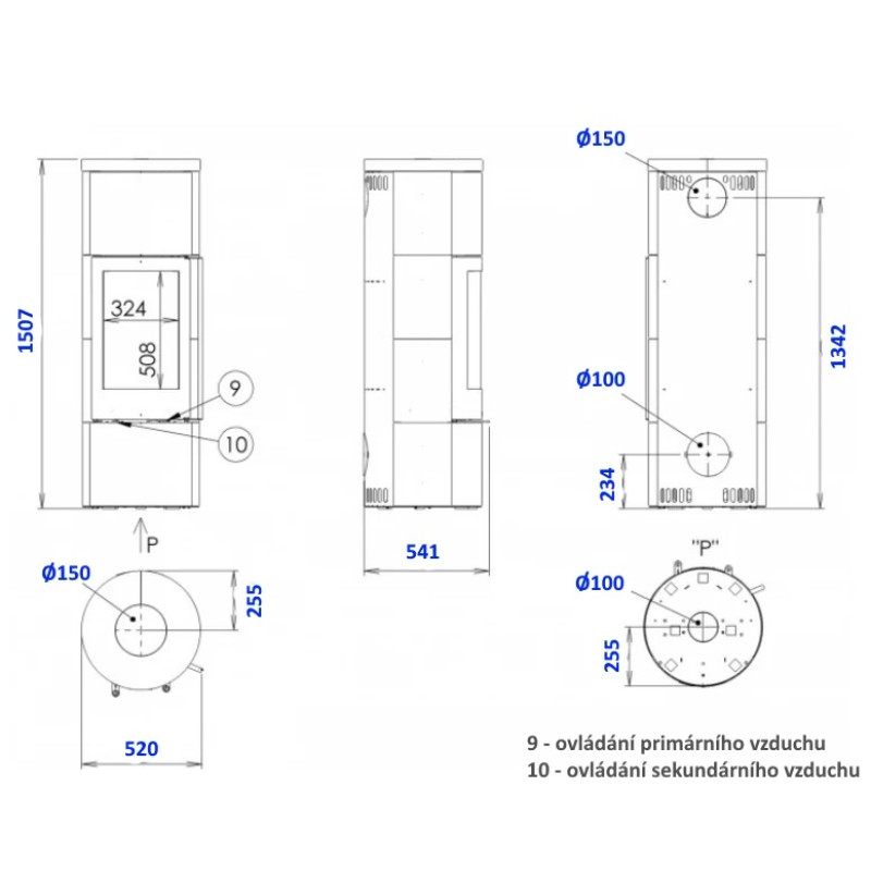 • možný přívod venkovního spalovacího vzduchu - průměr 100 mm (hrdlo pro připojení je součástí kamen)