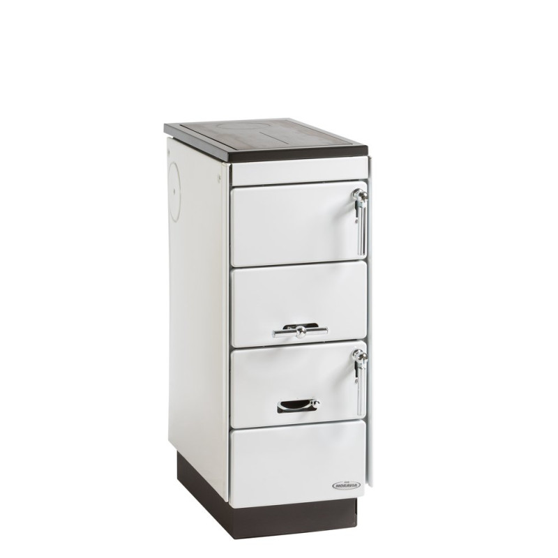 Kamna na pevná paliva bílá chromované doplňky, ocelová plotna stříkaná