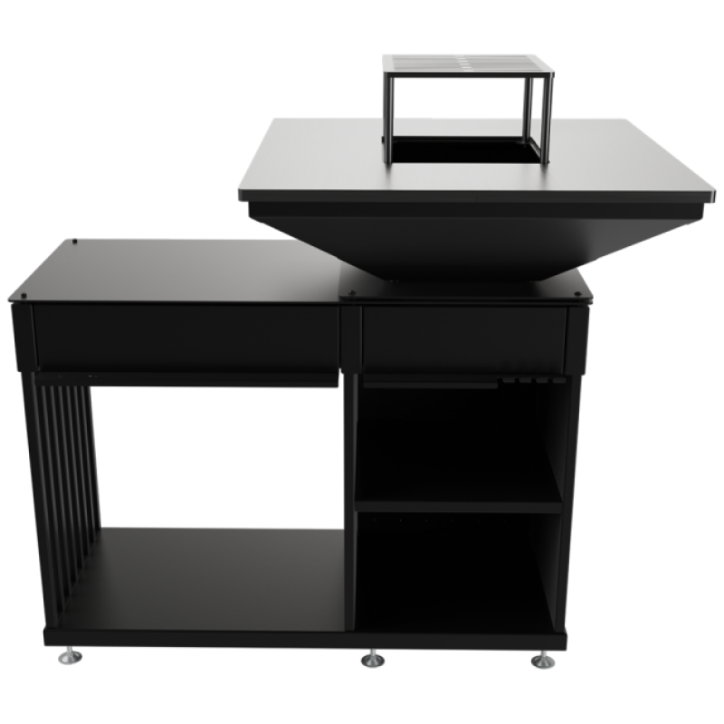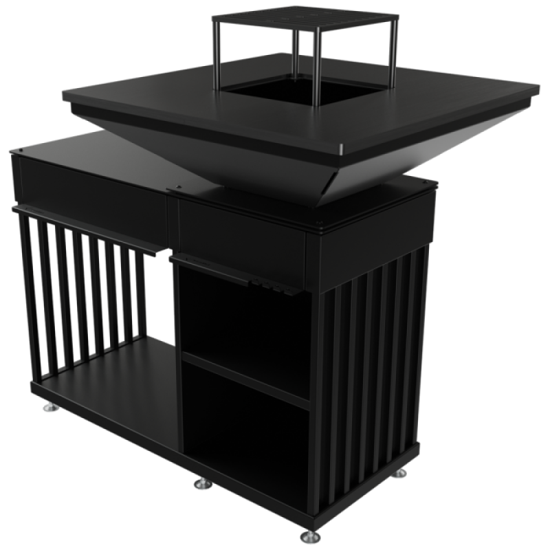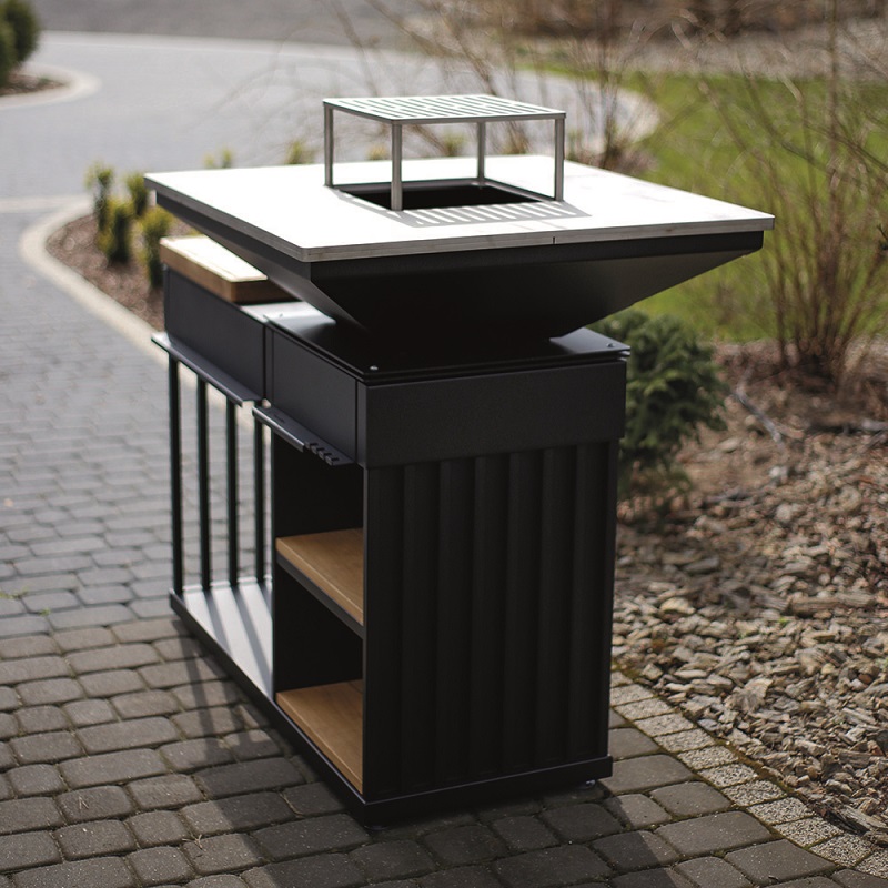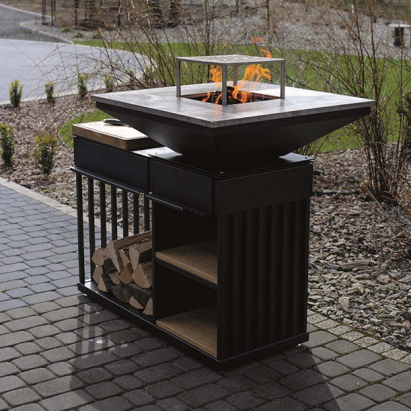 Vybaveno ocelovým roštem, praktickými úložnými přihrádkami na nádobí a koření s praktickou / prostornou dřevěnou dutinkou. Ohniště QUADRUM bbq není jen moderní zahradní gril, ale také plně vybavená venkovní kuchyň. Bude také perfektní jako zahradní ohniště s grilem - efektivní zdroj tepla za chladných večerů, stejně jako stylový a přirozený způsob osvětlení zahrady.