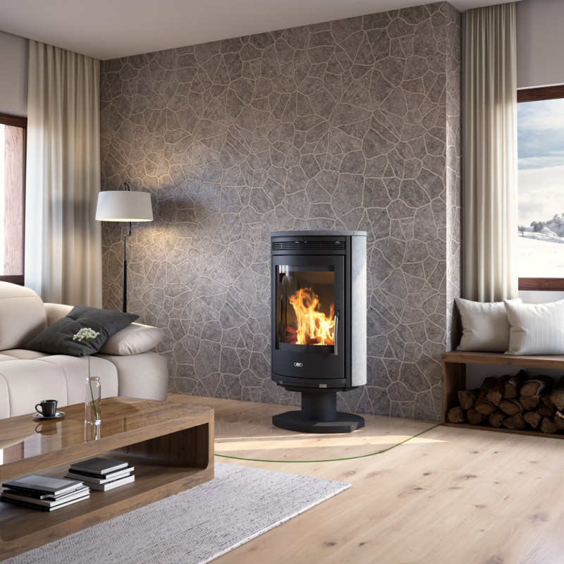 • Dvouplášťová teplovzdušná (konvekční) kamna otočná kolem svislé osy.