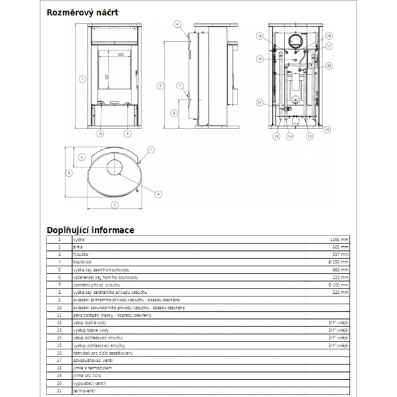 - Vodní objem výměníku je 8.5 litru vody. Jsou schopna vytopit prostor o objemu 100–240 m3. Spotřeba při jmenovitém výkonu je 3 kg/hod suchého dřeva.