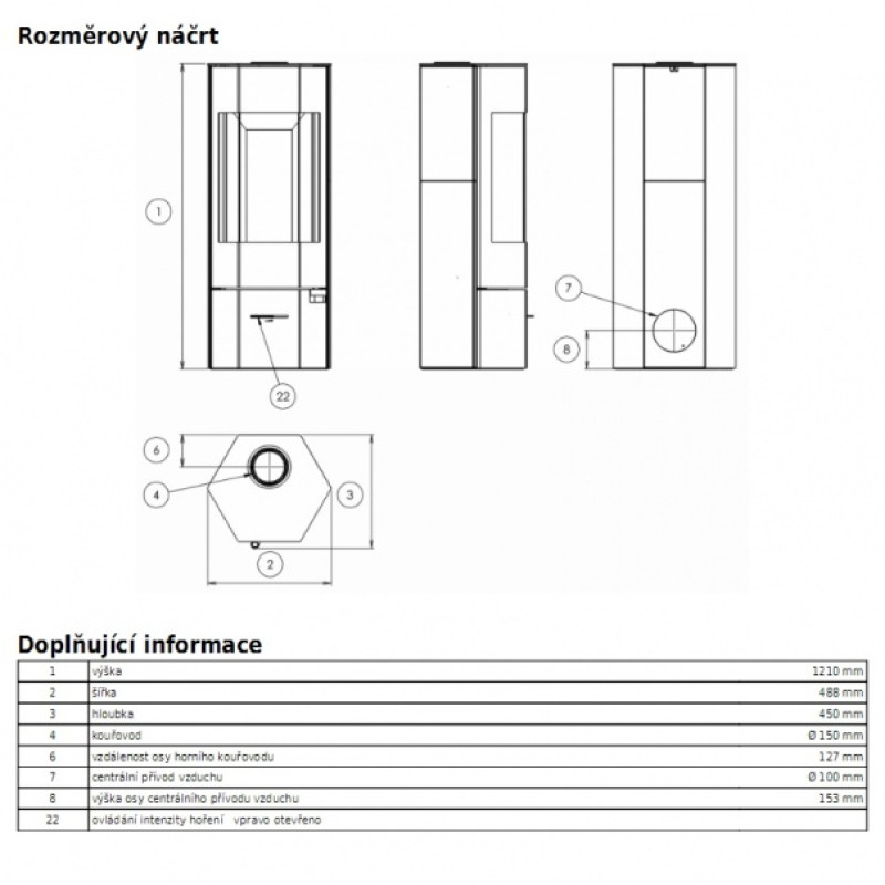 Krbová kamna vytopí prostor od 70 m3 až po 180 m3. Spotřeba paliva je 2,1 kg/hod.