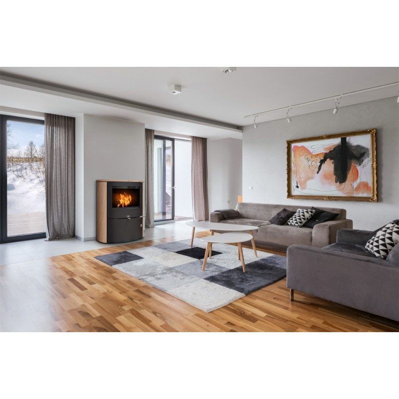 Dvouplášťová teplovzdušná (konvekční) kamna se širokým topeništěm pro polena až 56 cm dlouhá.