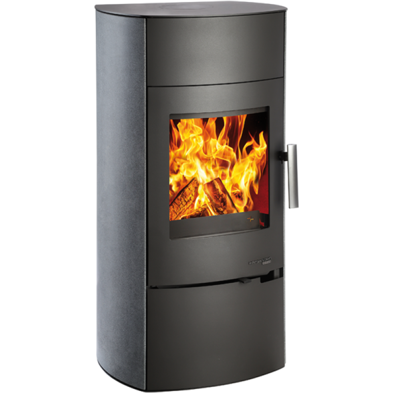 Kamna s obkladem denim blue. Správné nastavení hoření zvládnete díky jednoduchému regulátoru EASY Control, který je v podobě kotouče v dolní části topeniště.