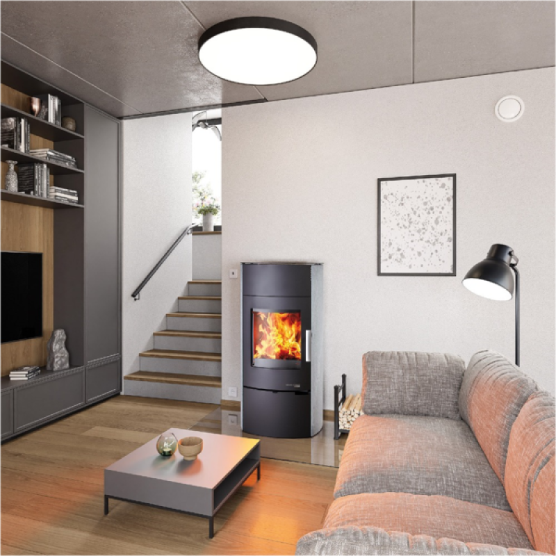 Kamna s obkladem denim blue. Správné nastavení hoření zvládnete díky jednoduchému regulátoru EASY Control, který je v podobě kotouče v dolní části topeniště.
