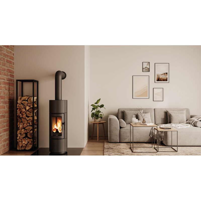 Kamna na dřevo MIKA kombinují moderní design a efektivní technologii vytápění v extra štíhlém formátu o šířce pouhých 37 cm. Navzdory svým kompaktním rozměrům se pyšní velkorysým průzorem, který nabízí nerušený výhled na plápolající oheň a vytváří tak obzvláště útulnou atmosféru.
