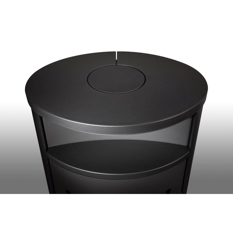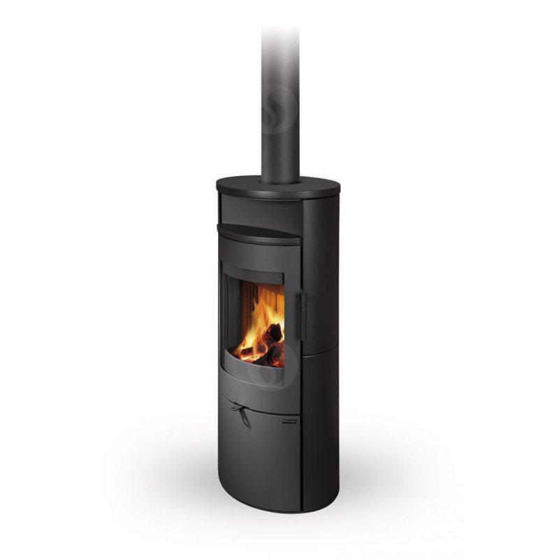 Oválný tvar krbových kamen LUGO N působí v interiéru útulným dojmem. Příjemnými detaily jsou například odkládací parapet nad ohništěm nebo klika dvířek, která svým technickým řešením i designem dává krbovým kamnům elegantní vzhled.