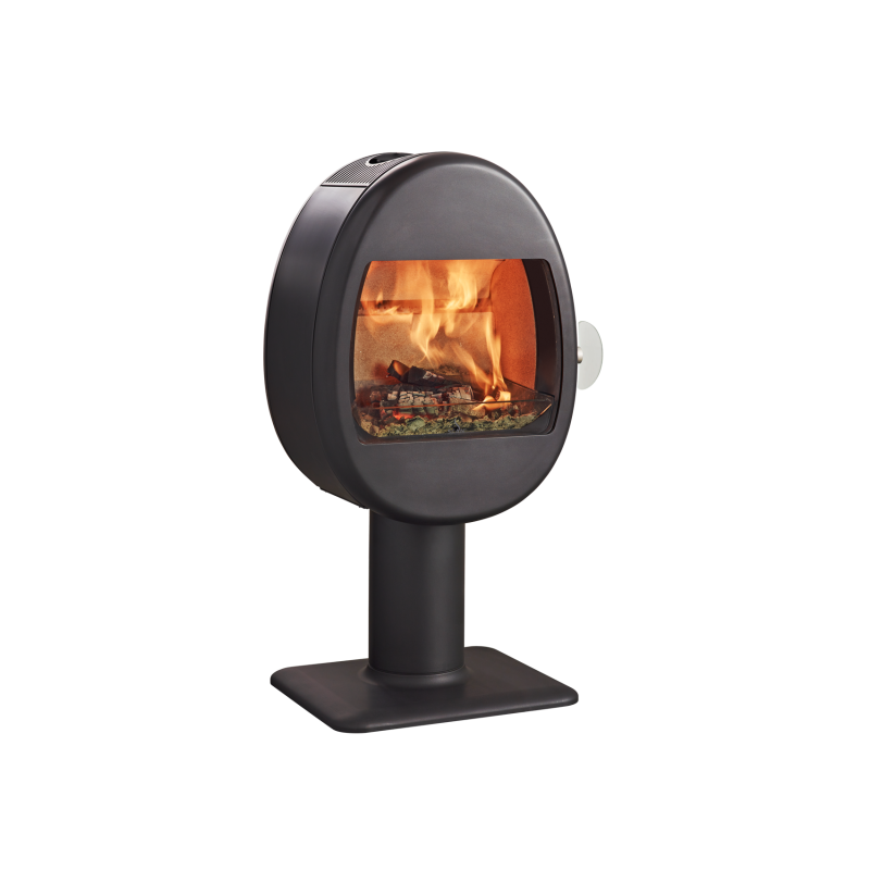 Scan 66–2 černý lak stojí na elegantní noze. Externí vzduch lze přivést přímo do topeniště kanálem skrytým uvnitř podstavce.