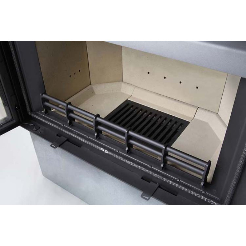 Krbová vložka Novara 17 s výměníkem zaujme velkými prosklenými dvířky. Ta mají barvu antracitu a ukrývají v sobě antireflexní sklo, které chrání ruce před popálením. Díky dvojitému prosklení probíhá spalování uvnitř při vyšších teplotách, sklo zůstává déle čisté, nečerná.