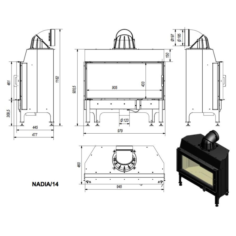 Teplovzdušné krbové vložky řady Nadia jsou vyrobeny v souladu s nejmodernějšími trendy v konstrukci vložek. Jsou vyrobeny z kotlové oceli, topeniště je vyloženo akumulačním materiálem Acumotte (žárový beton). Vložka je vybavena dvojitým prosklením dvířek (glass system) či pružinou dvířek. Tato vložka umožňuje změnu otevírání dvířek, standardně jsou panty vlevo a sami si je můžete přeinstalovat na opačnou stranu. Litinové hrdlo kouřovodu je stavitelné v rozsahu 360°, místo něj je možné dokoupit adaptér pro teplovodní výměník či pro akumulační kroužky, které rozšíří možnost využití tohoto topidla. Spalování je bezroštové, díky tomu odstraňujete z vložky minimum popela. Vzhledem ke své konstrukci a parametrům jsou tyto vložky vhodné i do nízkoenergetických domů a pro rekuperační systémy.