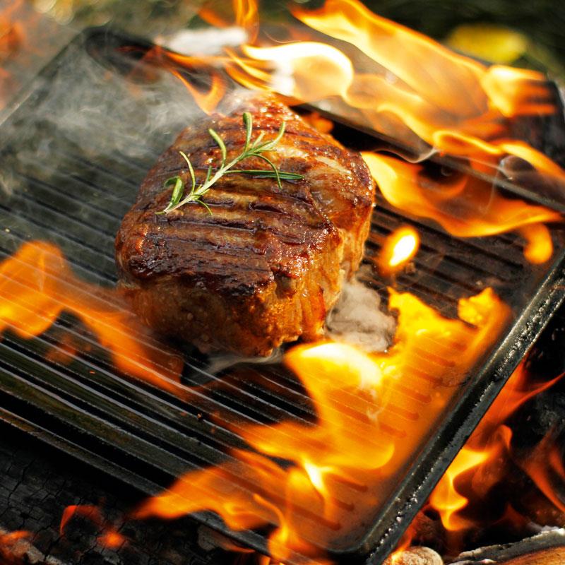 Vetší pečící forma K8 má víko s nožkami, po otočení tak můžete víko použít jako pánev. Díky drážkovanému profilu je ideální pro přípravu steaků s grilovaného masa.