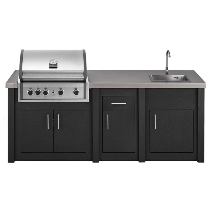 Komfortní grilovací centrum, které představuje zcela jinou dimenzi v oblasti venkovního vaření. Elegantní design, výkonný gril, bohatá výbava (mycí centrum nebo lednice) odolnost vůči povětrnostním vlivům, velká pracovní plocha a dostatek úložného prostoru jsou jedny z hlavních rysů této luxusní venkovní kuchyně. Hliníkové skříně opatřené elegantním práškovým nástřikem představují skvělou platformu pro odolnou pracovní desku s integrovaným grilem a dřezem. Grafitové skříňky perfektně ladí s šedou pracovní deskou a nerezovým plynovým grilem Grandpro Pro Elite, který je srdcem této venkovní kuchyně. Varné centrum je vybaveno mycí zónou v podobě skříňky se dřezem, zasazeným do desky, které poslouží základní hygieně a oplachu potravin. Dřez je vybaven kohoutkem na studenou vodu. Sestavu lze alternativně pořídit s 2-zónovou lednicí místo dřezu popř. doplnit o nízkou skříňku pro keramický gril Kamado, který může dále rozšířit možnosti tepelné úpravy pokrmů vaší venkovní kuchyně. Kuchyni lze dodat v provedení na zemní plyn.