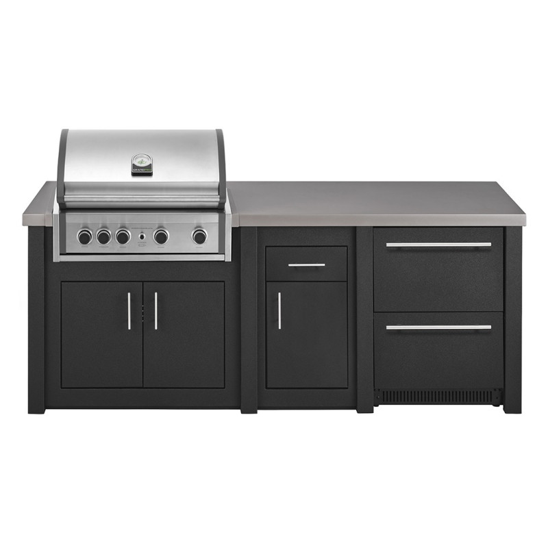 Komfortní grilovací centrum, které představuje zcela jinou dimenzi v oblasti venkovního vaření. Elegantní design, výkonný gril, bohatá výbava, odolnost vůči povětrnostním vlivům, velká pracovní plocha a dostatek úložného prostoru jsou jedny z hlavních rysů této luxusní venkovní kuchyně. Hliníkové skříně opatřené elegantním práškovým nástřikem představují skvělou platformu pro odolnou pracovní desku s integrovaným grilem a chladničkou. Grafitové skříňky perfektně ladí s šedou pracovní deskou a nerezovým plynovým grilem Grandpro Pro Elite, který je srdcem této venkovní kuchyně. Skříňka s lednicí obsahuje 2 chladící zásuvky, které lze teplotně regulovat zcela nezávisle. Kuchyňskou sestavu lze alternativně pořídit s dřezovou skříňkou místo lednice a popř. ji doplnit o nízkou skříňku pro keramický gril Kamado, který může dále rozšířit možnosti tepelné úpravy pokrmů vaší venkovní kuchyně. Kuchyni lze dodat v provedení na zemní plyn.