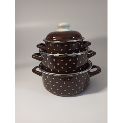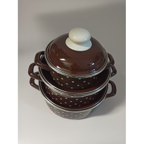 Variace smaltovaného nádobí s dekorem bílého puntíku, která je určena lidem milujícím tento dekor v kombinaci s decentnější hnědou barvou.