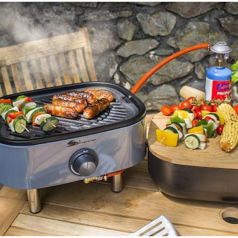 Chystáte se na dovolenou pod stan, do karavanu nebo si chcete užít grilování na zahradě nebo na pikniku? V tom případě oceníte piknikový párty gril Meva. Stylový přenosný propan-butanový gril je určen k venkovní přípravě pokrmů. Gril Meva je vybaven piezo zapalováním, litinovým roštem a dřevěným prkénkem pro přípravu a servirování pokrmů. Pro snadnou manipulaci a přenos je opatřen ramenním popruhem a madlem. Gril lze rozložit na jednotlivé části, které je možno pohodlně vyčistit. Gril je dodáván s příslušenstvím pro připojení ke kartuši se závitem 7/16.
