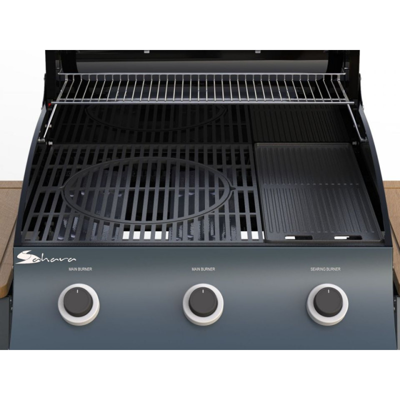 Propan-butanový gril s bambusovými výsuvnými bočními tácy.