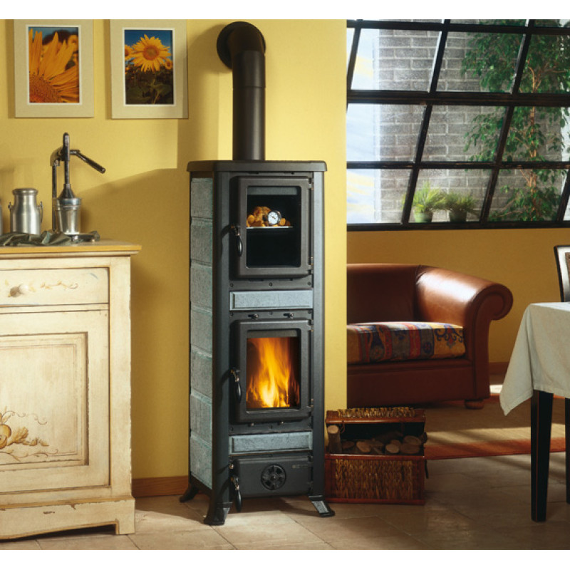 Krbová kamna na dřevo Fulvia 6 kW Nordica s funkční troubou na pečení.Bytelná dvouplášťová  kamna mají vnitřní korpus  z pozinkované oceli. Tato ochrana zcela vylučuje reznutí a řadí je v tomto směru mezi nezničitelné  Uvnitř jsou vložené na sebe jednotlivé litinové desky vyplňující celý spalovací prostor.  Vnitřní vroubkování  litiny má vliv na hoření a zamezuje praskání. Otočný litinový rošt a popelník umožňují dlouhodobé topení bez vyhasnutí.V horní části ohniště, před výstupem do komína jsou vloženy dva deflektory. Ty mají za úkol jednak omezit plameny do komína ale i zlepšit  průběh dohoření plynů ze dřeva.