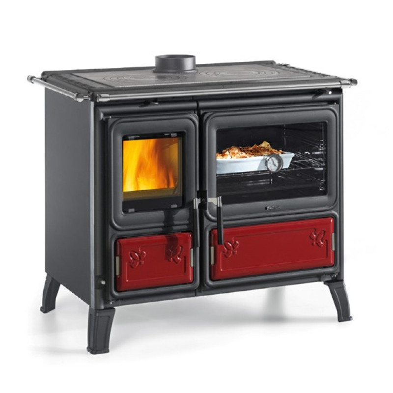 - Dvířka od topeniště mají dvojité prosklení, které omezuje nežádoucí sálavé teplo při vaření, kdy uživatel musí stát v jeho blízkosti a zároveň je mezi skly prudce předehříván vstupující sekundární vzduch pro dokonalé spalování.