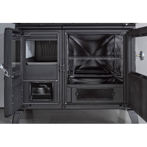 Kvalitní litinový sporák na topení dřevem a dřevěnými briketami s proskleným ohništěm a dekorativním kachlovým obkladem dvířek, zaručující nádherný vzhled. Kachlové obložení je nabízeno ve dvou barevných variantách – bordó a bílá. Tento typ sporáku se pyšní největší pečící troubou na trhu o objemu 78 l. Trouba je oboustranně smaltovaná, tudíž její povrch je odolný proti propálení a snadno se udržuje. Ve dvířkách trouby je integrovaný teploměr pro rychlou a přesnou kontrolu teploty, který tak zaručuje pohodlné pečení. Jako jeden z mála sporáků na trhu, umožňuje v zadní části napojení na externí přívod vzduchu a nečerpá tak vzduch pro hoření z místnosti.