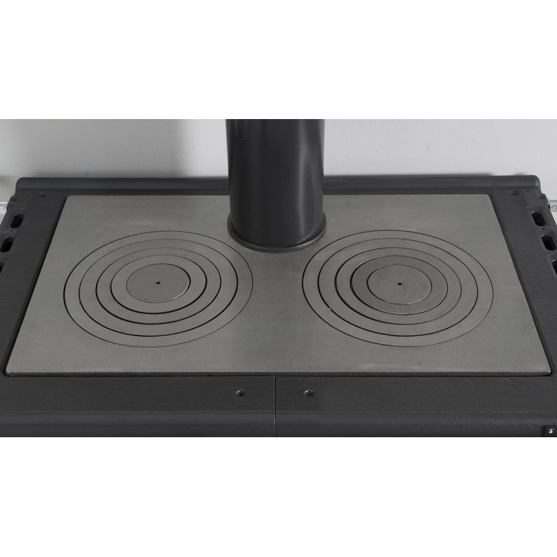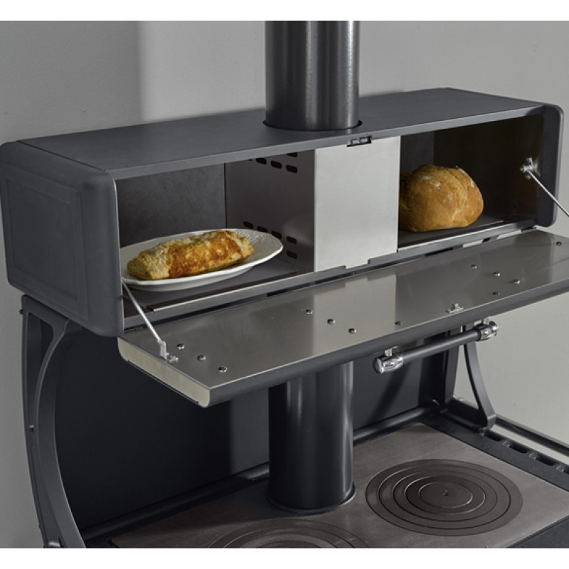 Sporák je vybaven ohřívací přihrádkou nad plotnu, pro ještě větší využití tepla při topení. Přihrádka je vyložena masivními přírodními kameny pro akumulaci tepla. Může tak sloužit k ohřevu pokrmů, sušení, dopékání nebo předehřívání talířů. Sporák je také možné zakoupit v základní verzi bez ohřívací přihrádky. (Milly)
