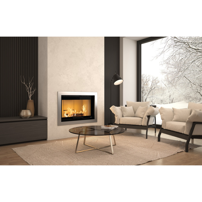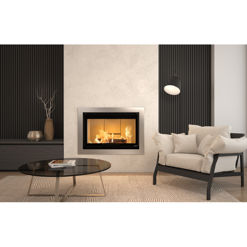 Krbová vložka je dvouplášťová s teplovzdušnými průduchy a v horní části jsou dvě litinové příruby o průměru 150mm, které se dají využít na rozvod teplého vzduchu do jiných místností. Rozvod tepla lze ještě podpořit zakoupením doplňkové sady ventilátoru, který je schopen teplo rozhánět do vzdálenějších místností. Šířka krbové vložky je 90 cm a umožňuje tak přikládání i větších polen do maximální délky 75 cm.