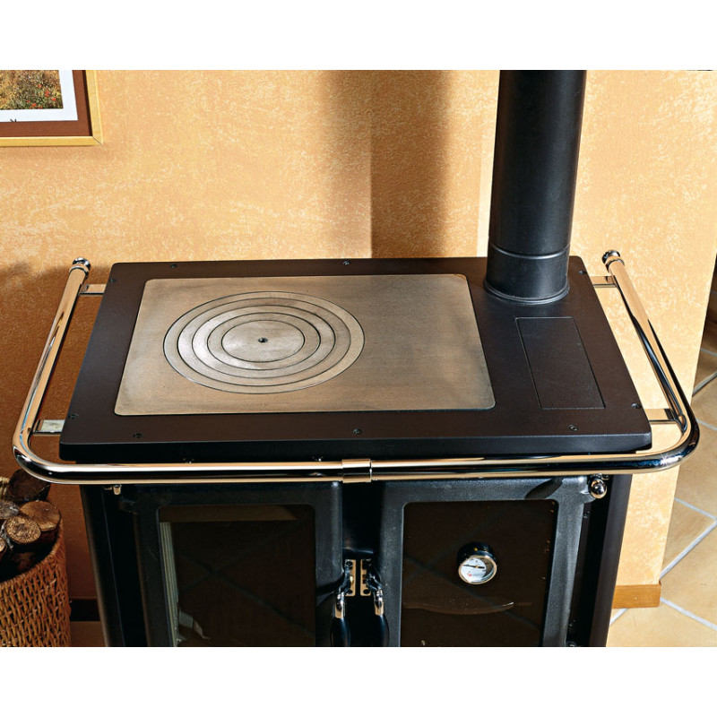 - Kolem celé plotny je chromované madlo, které sporák zdobí a zároveň se dá využít pro odkládání a sušení utěrek nebo také pro zavěšení krbového nářadí.