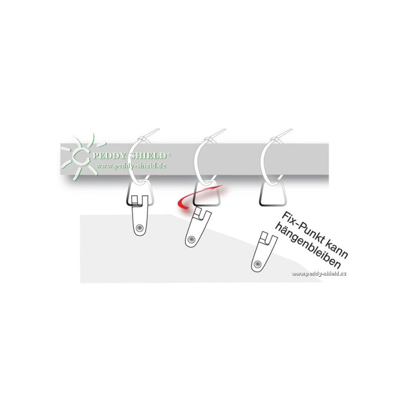 Otočný systém pro rychlé a snadné připevnění balkónové plachty bez kovových oček.