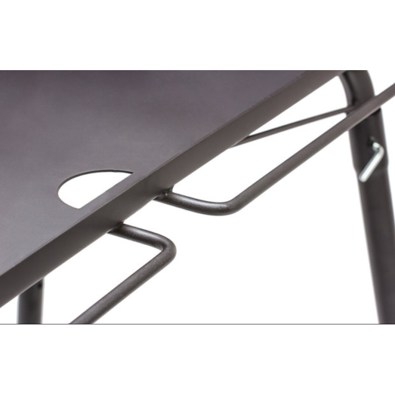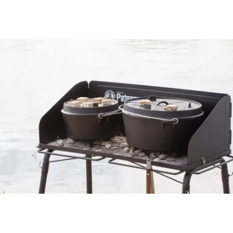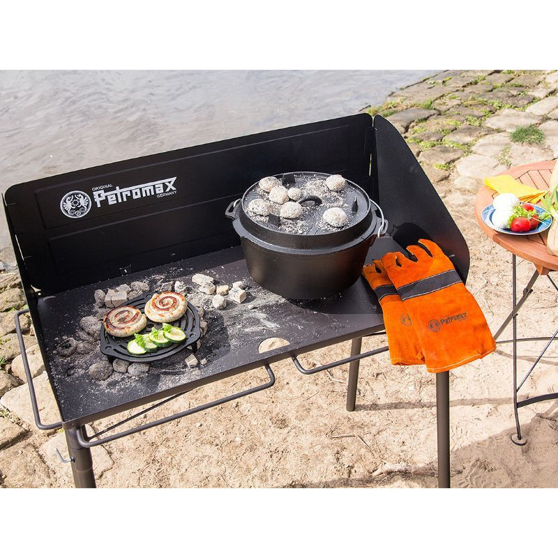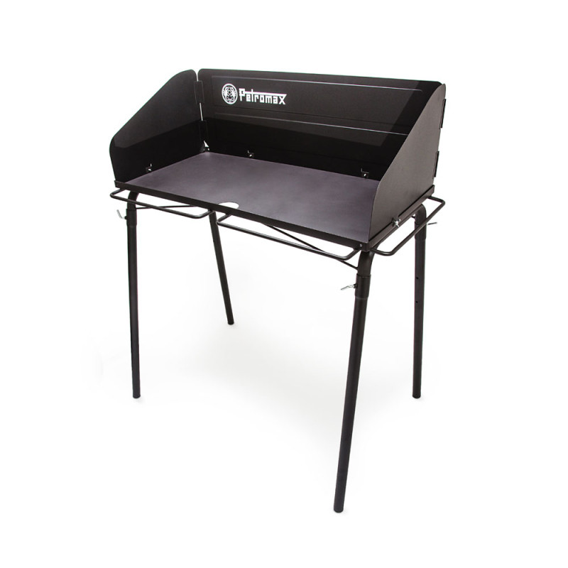 Stůl pro vaření na ohni. Díky stolu lze vařit na ohni v ideální pracovní výšce. Alternativně lze nohy odstranit a umístit stůl na jakýkoli podklad. Ochranné zástěny šetří energii a uhlí při vaření za větrného počasí. Přední a boční úchyty nabízí možnost zavěšení kleští na dřevěné uhlí, utěrek nebo grilovacích rukavic. Při čištění stolu lze zbytky popela a uhlí jednoduše vymetat otvorem v přední části pracovní plochy.