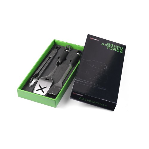 Elegantní sada grilovacího náčiní. Všechny nástroje jsou vyrobeny z kartáčované ušlechtilé oceli s očky pro jejich snadné zavěšení. Nářadí je opatřeno měkkými silikonovými gripy pro pevný a pohodlný úchop. Designově zdařilé grilovací nářadí je optimálně dlouhé, aby zajistilo bezpečnou manipulaci s grilovaným pokrmem, a to v dostatečné vzdálenosti od žáru nad grilovacím roštem. Grilovací kleště jsou opatřeny uzamykacím mechanismem. Vroubky poskytnou lepší kontrolu při manipulaci s grilovaným pokrmem. Obracečka díky svému zešikmení skvěle klouže po grilovacím roštu pod grilovaný pokrm. Vroubkaté ostří umožní porcování jídla přímo na grilovacím roštu. Příjemným bonusem je integrovaný otvírák na láhve. Tvar kartáče maximalizuje kontakt s grilovacím roštem při jeho čištění. Užitnou hodnotu zvyšuje možnost výměny čistící hlavy kartáče (příplatkové příslušenství). Upozornění - nářadí se nesmí mýt v myčce na nádobí.