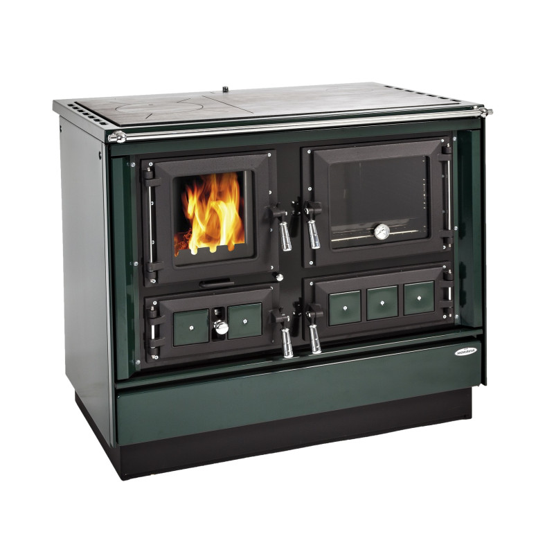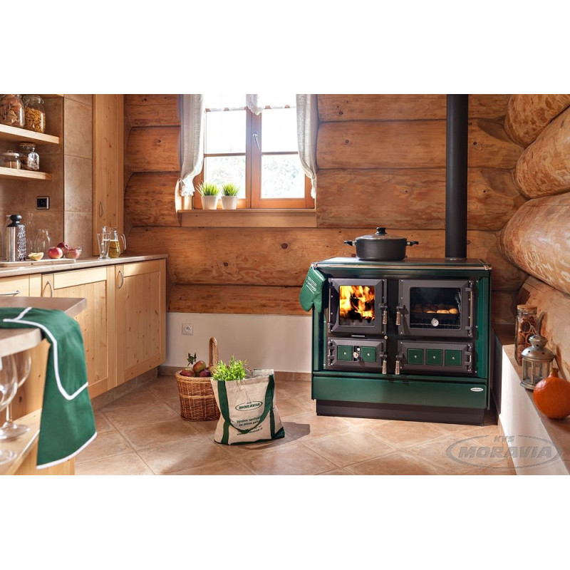 Sporák na pevná paliva zelený pravý, chromované doplňky, smaltovaný zelený rám, broušená plotna