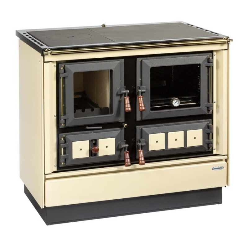 Sporák na pevná paliva béžový, pravý, titanové (zlaté) doplňky, dřevěná madla, smaltovaný černý rám plotny, ocelová plotna dělená stříkaná