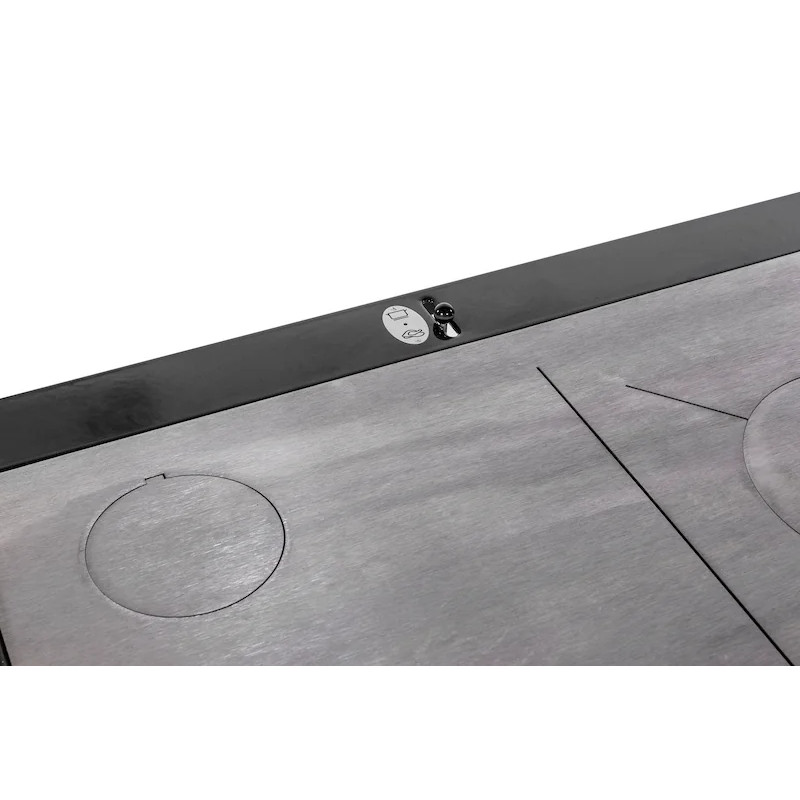 Antracit levý, chromované doplňky, ocelová broušená plotna, nerezový broušený rám plotny.