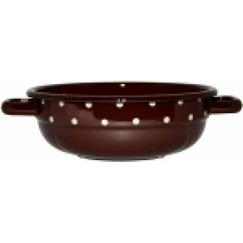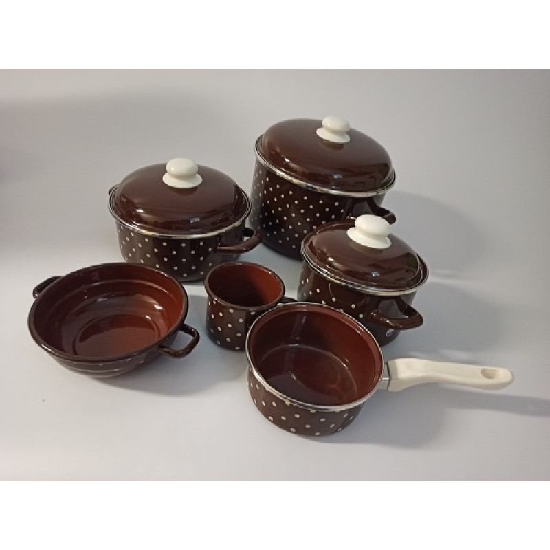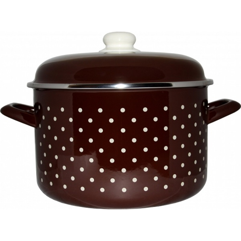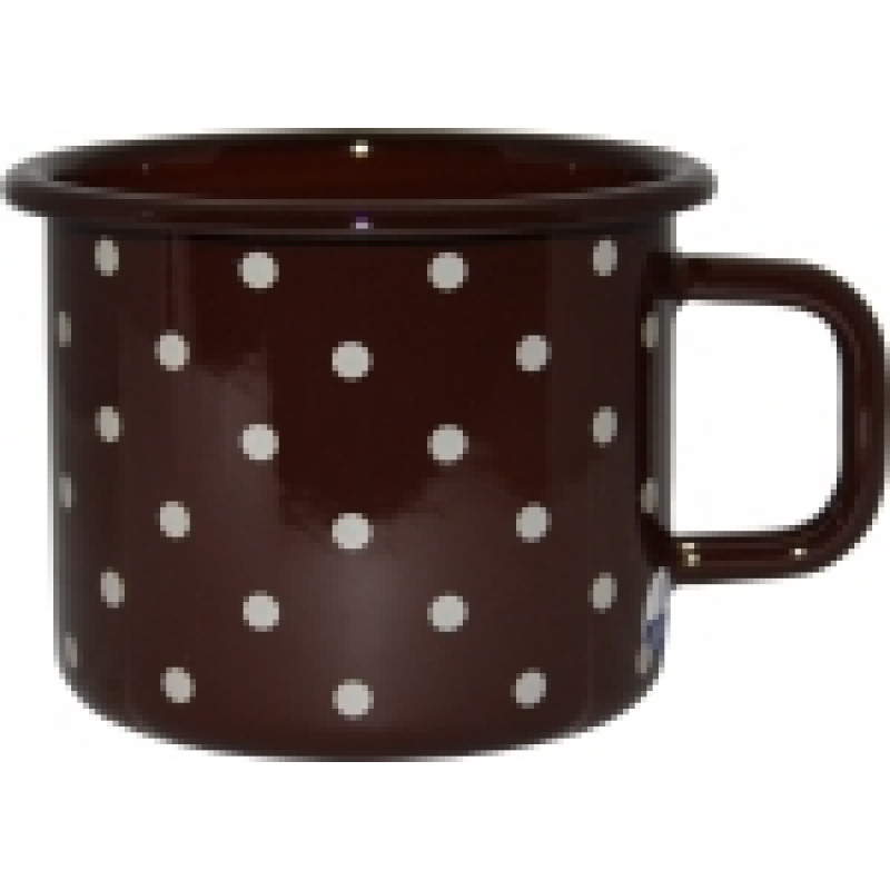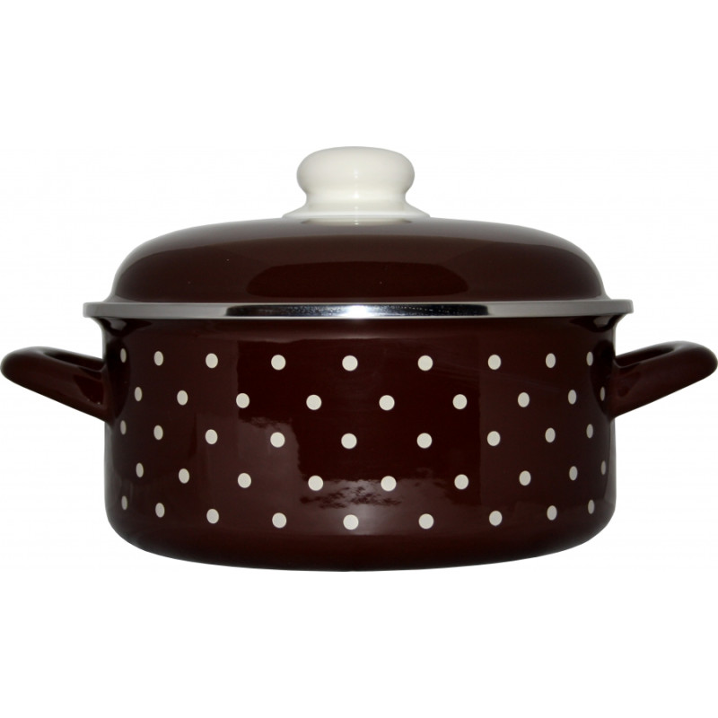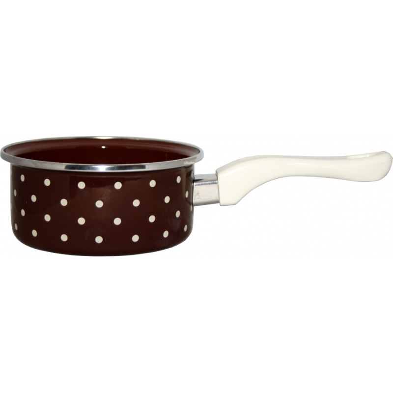 Variace smaltovaného nádobí s dekorem bílého puntíku, která je určena lidem milujícím tento dekor v kombinaci s decentnější hnědou barvou.