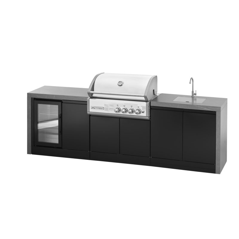 Komfortní grilovací centrum nastavuje nové standardy pro venkovní vaření. Varné centrum je vybaveno mycí zónou v podobě boční skříňky se dřezem, zasazeným do desky s kohoutkem na studenou vodu. Kuchyně rovněž obsahuje skříňku s lednicí, která je zárukou, že budete mít potřebné potraviny a nápoje dokonale vychlazené. Velká pracovní plocha a dostatek úložného prostoru jsou jedny z hlavních rysů této venkovní kuchyně. Boční skříňky s kamennou deskou nabízí dostatek pracovního místa a další odkládací prostor. Ocelové modulové skříně opatřené elegantním práškovým nástřikem představují skvělou platformu pro masivní 60 mm pracovní desku ze slinutého kamene, kterou doplňuje obklad boků (model WF = Waterfall). Černé skříňky perfektně ladí s nerezovým plynovým vestavným grilem CROSSRAY+ 4B s unikátními infračervenými hořáky, který je srdcem této venkovní kuchyně. Pokud máte rádi venkovní vaření na vaší terase nebo zahradě, tato stylová venkovní kuchyně by Vás měla oslovit. Kuchyně pro náročné.