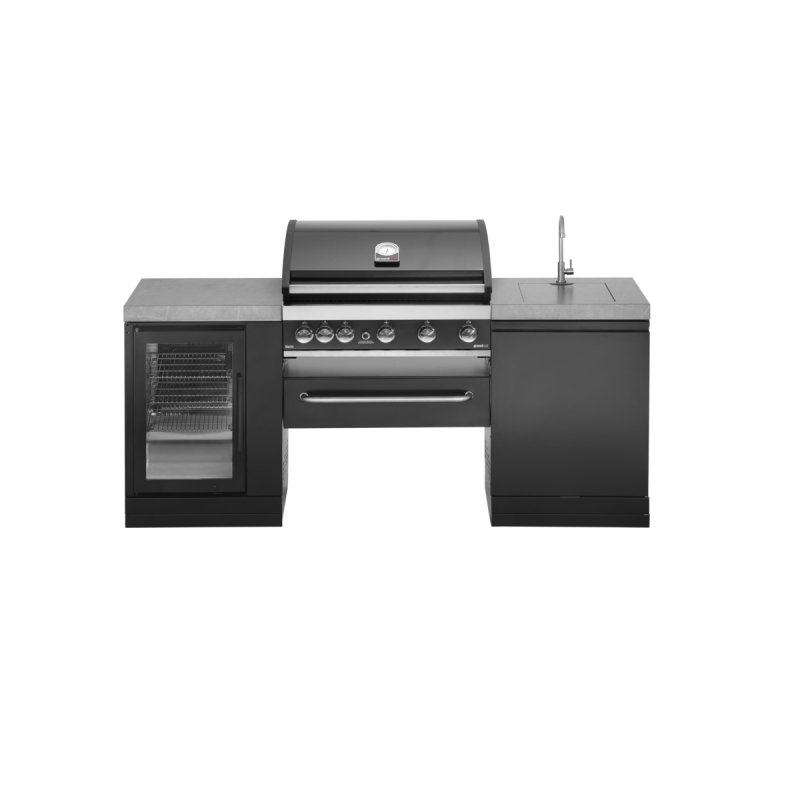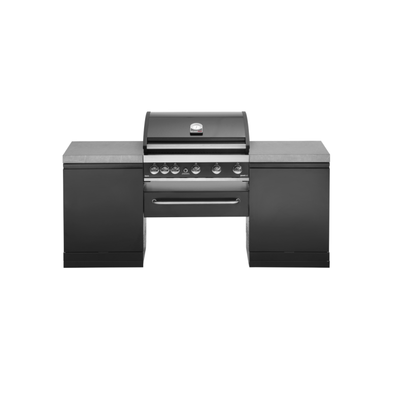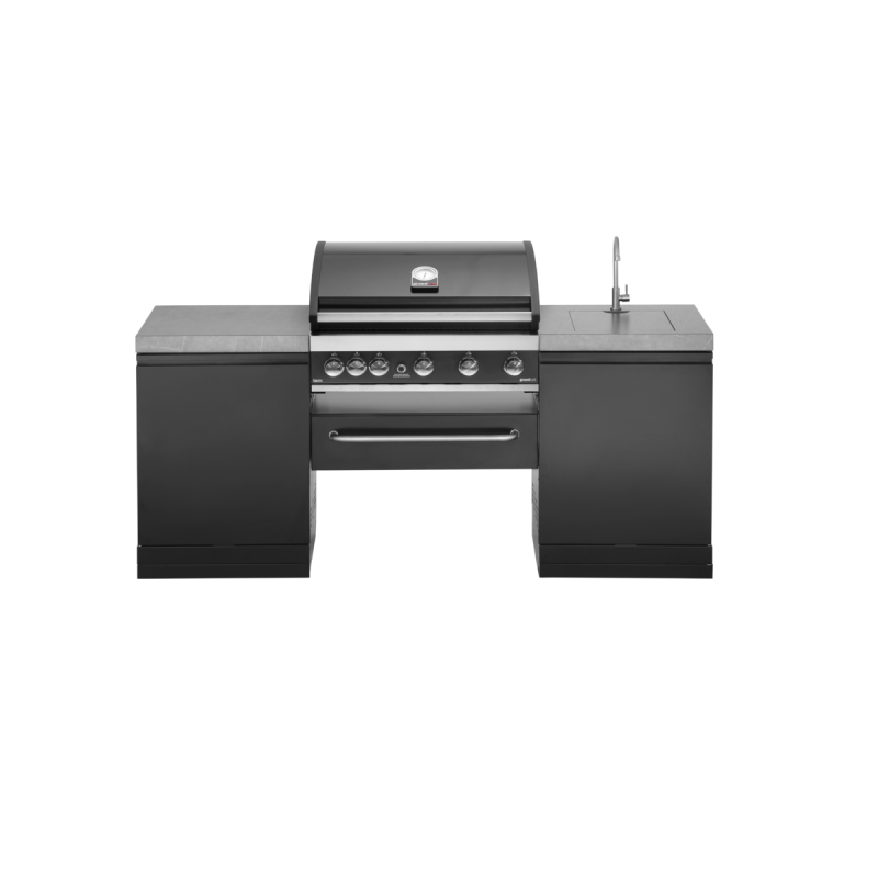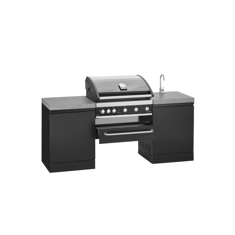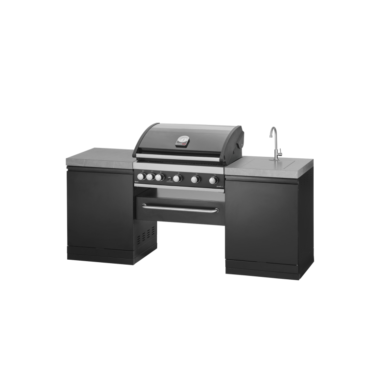 Užší verze oblíbené kuchyně Maxim. Kompletní kuchyňské centrum pro komfortní vaření na Vaší zahradě, terase nebo pod pergolou. Srdcem kuchyně je velký plynový gril GrandHall Maxim G5, který disponuje velkou litinovou grilovací plochou, 5 nerez hořáky a 1 zadním infračerveným hořákem pro opékání na otočném špízu. Ocelové skříňky v elegantní černé barvě dokonale ladí s masivní deskou z umělého kamene a nabízejí dostatek pracovního místa i úložného prostoru. Boční skříně s kamennou deskou poskytuje dostatek pracovního a odkládacího prostoru. Ten je rovněž k dispozici ve středové zásuvce. Snadný přístup do skříněk zajistí dvířka s magnety. Černá barva skříněk perfektně ladí s nerezovým akcenty grilu a umyvadla. Pokud máte rádi venkovní vaření na vaší terase nebo zahradě, tato venkovní kuchyně s vestavným plynovým grilem by Vás mohl oslovit. Sestavu lze případně ještě rozšířit o mycí zónu v podobě skříňky s vestavným dřezem a kohoutkem na studenou vodu, která zajistí veškerou hygienu a oplach nádobí, zeleniny či ovoce nebo skříň s kamennou pracovní deskou a lednicí. Venkovní kuchyně je osazena grilem Grandhall Maxim G5, který je určen pro spalování propan-butanu. Gril lze však přestavět na zemní plyn, kdy vzroste komfort grilování, a to díky absenci potřeby výměny plynových lahví. Nejprodávanější venkovní kuchyně Grandhall.