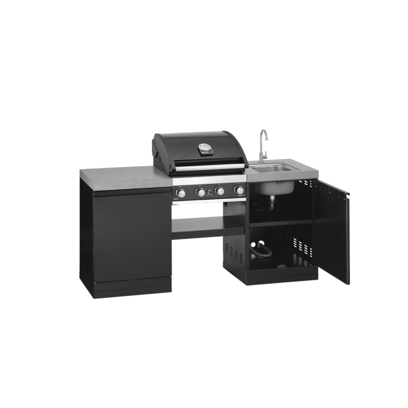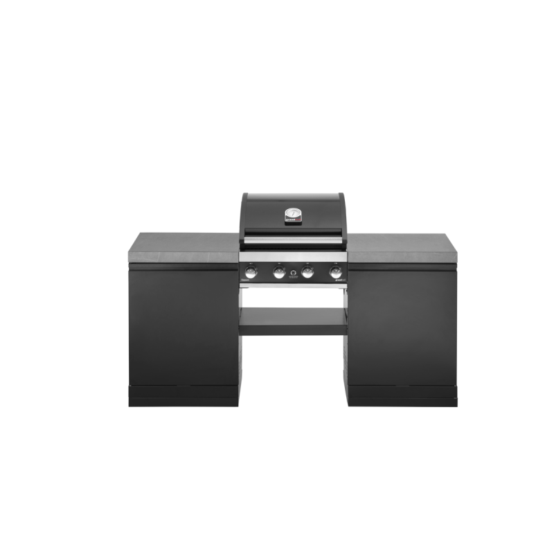 Kompletní kuchyňské centrum pro komfortní vaření na Vaší zahradě, terase nebo pod pergolou. Srdcem kuchyně je velký plynový gril GrandHall Premium G4, který je vybaven litinovou grilovací plochou a 4 nerez hořáky. Ocelové skříňky v elegantní černé barvě dokonale ladí s masivní deskou z umělého kamene a nabízejí dostatek pracovního místa i úložného prostoru. Mycí zóna s vestavným dřezem a kohoutkem na studenou vodu zajistí veškerou hygienu a oplach nádobí, zeleniny či ovoce. Boční skříň s kamennou deskou poskytuje dostatek pracovního a odkládacího prostoru. Snadný přístup do skříněk zajistí dvířka s magnety. Černá barva skříněk perfektně ladí s nerezovým akcenty grilu a umyvadla. Pokud máte rádi venkovní vaření na vaší terase nebo zahradě, tato venkovní kuchyně s vestavným plynovým grilem by Vás mohl oslovit. Sestavu lze případně ještě rozšířit o modulovou skříň s kamennou pracovní deskou a lednicí. Venkovní kuchyně je osazena grilem Grandhall Premium G4, který je určen pro spalování propan-butanu. Gril lze však přestavět na zemní lyn, kdy vzroste komfort grilování, a to díky absenci potřeby výměny plynových lahví. Nejmenší venkovní kuchyně z nabídky.